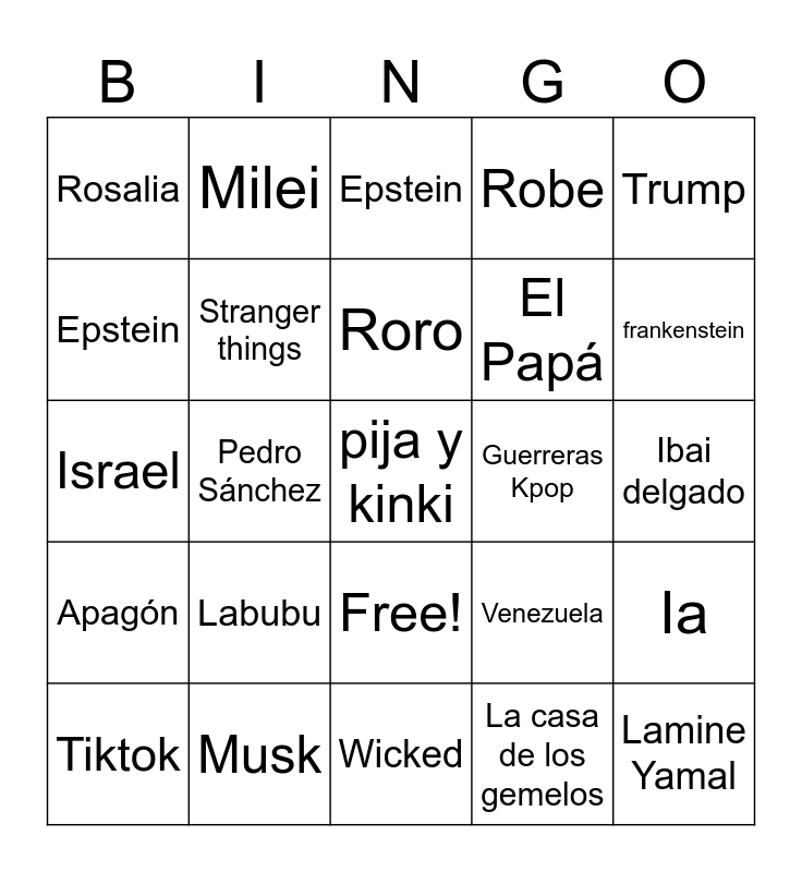 This bingo card has 26 words: Free!, La casa de los gemelos, Roro, Musk, Trump, Rosalia, Epstein, Milei, Ibai delgado, Venezuela, El Papá, Israel, Ia, Tiktok, Pedro Sánchez, Mandani, Robe, Apagón, Epstein, pija y kinki, frankenstein, Wicked, Guerreras Kpop, Labubu, Stranger things and Lamine Yamal.