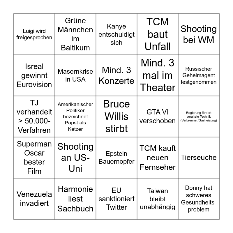 This bingo card has a free space and 24 words: Shooting an US-Uni, Harmonie liest Sachbuch, Mind. 3 Konzerte, Venezuela invadiert, Shooting bei WM, Luigi wird freigesprochen, Isreal gewinnt Eurovision, Grüne Männchen im Baltikum, GTA VI verschoben, Epstein Bauernopfer, Mind. 3 mal im Theater, TJ verhandelt > 50.000-Verfahren, TCM kauft neuen Fernseher, Tierseuche, Masernkrise in USA, Taiwan bleibt unabhängig, Regierung fördert veraltete Technik (Verbrenner/Gasheizung), Kanye entschuldigt sich, Russischer Geheimagent festgenommen, Amerikanischer Politiker bezeichnet Papst als Ketzer, Donny hat schweres Gesundheits- problem, Superman Oscar bester Film, TCM baut Unfall and EU sanktioniert Twitter.