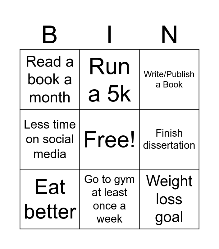 This bingo card has a free space and 8 words: Finish dissertation, Write/Publish a Book, Run a 5k, Eat better, Read a book a month, Weight loss goal, Less time on social media and Go to gym at least once a week.