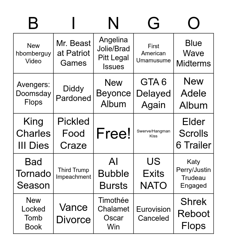 This bingo card has a free space and 24 words: Third Trump Impeachment, Vance Divorce, New Beyonce Album, New Locked Tomb Book, Blue Wave Midterms, New hbomberguy Video, Avengers: Doomsday Flops, Mr. Beast at Patriot Games, Swerve/Hangman Kiss, AI Bubble Bursts, GTA 6 Delayed Again, King Charles III Dies, US Exits NATO, Katy Perry/Justin Trudeau Engaged, Diddy Pardoned, Eurovision Canceled, Elder Scrolls 6 Trailer, Angelina Jolie/Brad Pitt Legal Issues, New Adele Album, Pickled Food Craze, Shrek Reboot Flops, Bad Tornado Season, First American Umamusume and Timothée Chalamet Oscar Win.