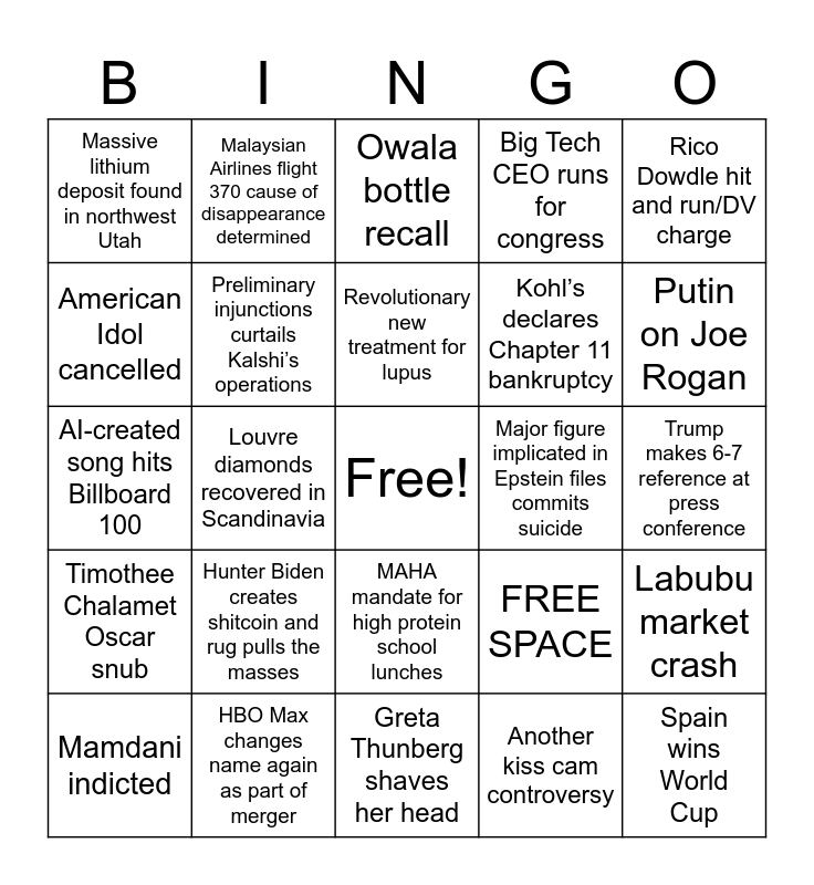 This bingo card has a free space and 25 words: Hunter Biden creates shitcoin and rug pulls the masses, Greta Thunberg shaves her head, Revolutionary new treatment for lupus, Mamdani indicted, Rico Dowdle hit and run/DV charge, Massive lithium deposit found in northwest Utah, American Idol cancelled, Malaysian Airlines flight 370 cause of disappearance determined, Major figure implicated in Epstein files commits suicide, MAHA mandate for high protein school lunches, Kohl’s declares Chapter 11 bankruptcy, AI-created song hits Billboard 100, FREE SPACE, Labubu market crash, Preliminary injunctions curtails Kalshi’s operations, Arch Manning Achilles tear, Trump makes 6-7 reference at press conference, Owala bottle recall, Putin on Joe Rogan, Louvre diamonds recovered in Scandinavia, Spain wins World Cup, HBO Max changes name again as part of merger, Timothee Chalamet Oscar snub, Big Tech CEO runs for congress and Another kiss cam controversy.