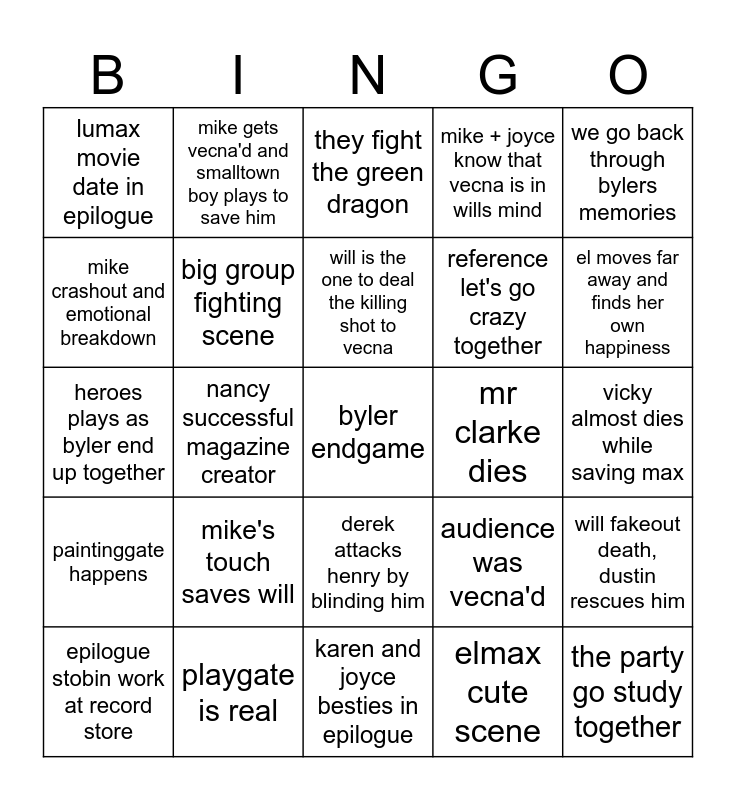 This bingo card has a free space and 24 words: mike's touch saves will, playgate is real, will is the one to deal the killing shot to vecna, epilogue stobin work at record store, we go back through bylers memories, lumax movie date in epilogue, mike crashout and emotional breakdown, mike gets vecna'd and smalltown boy plays to save him, mr clarke dies, derek attacks henry by blinding him, reference let's go crazy together, heroes plays as byler end up together, audience was vecna'd, will fakeout death, dustin rescues him, big group fighting scene, elmax cute scene, vicky almost dies while saving max, they fight the green dragon, el moves far away and finds her own happiness, nancy successful magazine creator, the party go study together, paintinggate happens, mike + joyce know that vecna is in wills mind and karen and joyce besties in epilogue.