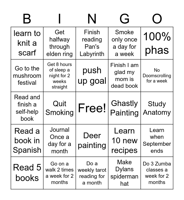 This bingo card has a free space and 24 words: Journal Once a day for a month, Go on a walk 2 times a week for 2 months, push up goal, Read 5 books, 100% phas, learn to knit a scarf, Go to the mushroom festival, Get halfway through elden ring, Ghastly Painting, Deer painting, Finish I am glad my mom is dead book, Read and finish a self-help book, Learn 10 new recipes, Learn when September ends, Get 8 hours of sleep a night for 2 weeks straight, Make Dylans spiderman hat, Study Anatomy, Finish reading Pan's Labyrinth, No Doomscrolling for a week, Quit Smoking, Do 3 Zumba classes a week for 2 months, Read a book in Spanish, Smoke only once a day for a week and Do a weekly tarot reading for a month.