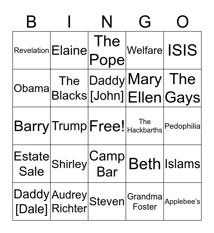 This bingo card has a free space and 25 words: Shirley, Steven, Daddy [John], Daddy [Dale], ISIS, Revelation, Obama, Elaine, The Hackbarths, Camp Bar, Mary Ellen, Barry, Beth, Islams, The Blacks, The Catholics, Pedophilia, The Pope, The Gays, Trump, Applebee’s, Audrey Richter, Estate Sale, Welfare and Grandma Foster.