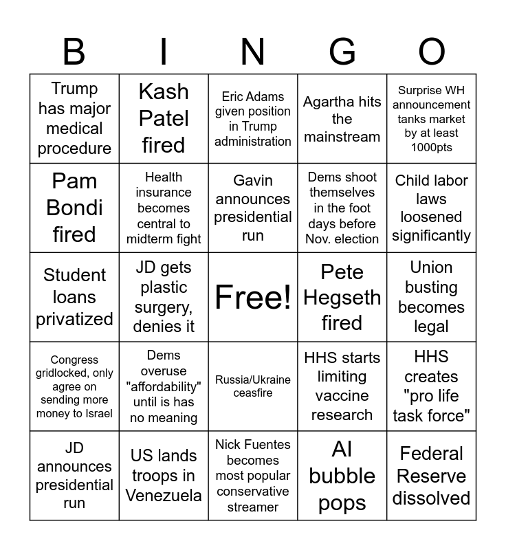 This bingo card has a free space and 24 words: Dems overuse "affordability" until is has no meaning, US lands troops in Venezuela, Gavin announces presidential run, JD announces presidential run, Surprise WH announcement tanks market by at least 1000pts, Trump has major medical procedure, Pam Bondi fired, Kash Patel fired, Pete Hegseth fired, Russia/Ukraine ceasfire, Dems shoot themselves in the foot days before Nov. election, Student loans privatized, HHS starts limiting vaccine research, HHS creates "pro life task force", Health insurance becomes central to midterm fight, AI bubble pops, Union busting becomes legal, Eric Adams given position in Trump administration, Child labor laws loosened significantly, JD gets plastic surgery, denies it, Federal Reserve dissolved, Congress gridlocked, only agree on sending more money to Israel, Agartha hits the mainstream and Nick Fuentes becomes most popular conservative streamer.
