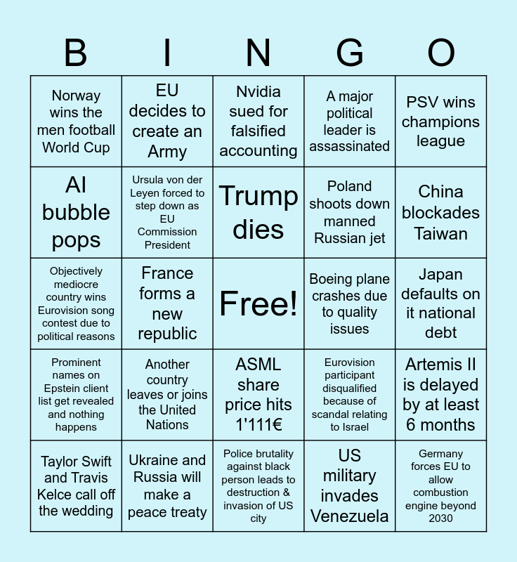 This bingo card has a free space and 24 words: Another country leaves or joins the United Nations, Ukraine and Russia will make a peace treaty, Trump dies, Taylor Swift and Travis Kelce call off the wedding, PSV wins champions league, Norway wins the men football World Cup, AI bubble pops, EU decides to create an Army, Boeing plane crashes due to quality issues, ASML share price hits 1'111€, Poland shoots down manned Russian jet, Objectively mediocre country wins Eurovision song contest due to political reasons, Eurovision participant disqualified because of scandal relating to Israel, Artemis II is delayed by at least 6 months, Ursula von der Leyen forced to step down as EU Commission President, US military invades Venezuela, Japan defaults on it national debt, Nvidia sued for falsified accounting, China blockades Taiwan, France forms a new republic, Germany forces EU to allow combustion engine beyond 2030, Prominent names on Epstein client list get revealed and nothing happens, A major political leader is assassinated and Police brutality against black person leads to destruction & invasion of US city.