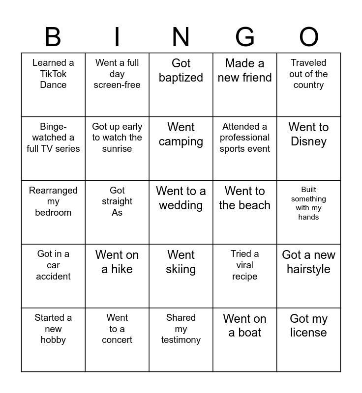 This bingo card has a free space and 24 words: Went on a hike, Went to a concert, Went camping, Started a new hobby, Traveled out of the country, Learned a TikTok Dance, Binge-watched a full TV series, Went a full day screen-free, Went to the beach, Went skiing, Attended a professional sports event, Rearranged my bedroom, Tried a viral recipe, Got a new hairstyle, Got up early to watch the sunrise, Went on a boat, Built something with my hands, Got baptized, Went to Disney, Got straight As, Got my license, Got in a car accident, Made a new friend and Shared my testimony.