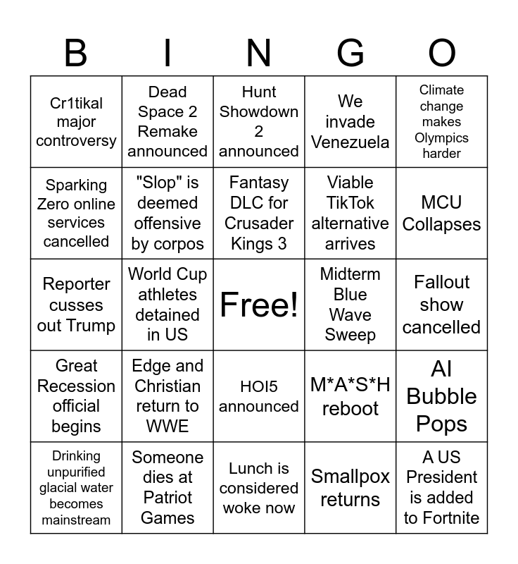 This bingo card has a free space and 24 words: Edge and Christian return to WWE, Someone dies at Patriot Games, Fantasy DLC for Crusader Kings 3, Drinking unpurified glacial water becomes mainstream, Climate change makes Olympics harder, Cr1tikal major controversy, Sparking Zero online services cancelled, Dead Space 2 Remake announced, Midterm Blue Wave Sweep, HOI5 announced, Viable TikTok alternative arrives, Reporter cusses out Trump, M*A*S*H reboot, AI Bubble Pops, "Slop" is deemed offensive by corpos, Smallpox returns, Fallout show cancelled, Hunt Showdown 2 announced, MCU Collapses, World Cup athletes detained in US, A US President is added to Fortnite, Great Recession official begins, We invade Venezuela and Lunch is considered woke now.