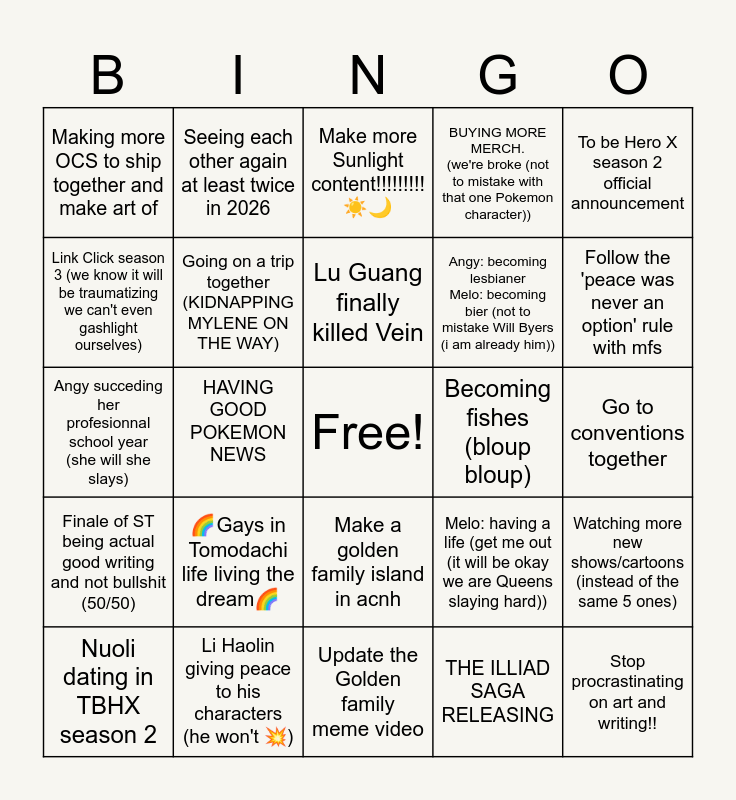 This bingo card has a free space and 24 words: 🌈Gays in Tomodachi life living the dream🌈, Li Haolin giving peace to his characters (he won't 💥), Lu Guang finally killed Vein, Nuoli dating in TBHX season 2, To be Hero X season 2 official announcement, Making more OCS to ship together and make art of, Link Click season 3 (we know it will be traumatizing we can't even gashlight ourselves), Seeing each other again at least twice in 2026, Becoming fishes (bloup bloup), Make a golden family island in acnh, Angy: becoming lesbianer Melo: becoming bier (not to mistake Will Byers (i am already him)), Angy succeding her profesionnal school year (she will she slays), Melo: having a life (get me out (it will be okay we are Queens slaying hard)), Watching more new shows/cartoons (instead of the same 5 ones), Going on a trip together (KIDNAPPING MYLENE ON THE WAY), THE ILLIAD SAGA RELEASING, Go to conventions together, Make more Sunlight content!!!!!!!!! ☀️🌙, Follow the 'peace was never an option' rule with mfs, HAVING GOOD POKEMON NEWS, Stop procrastinating on art and writing!!, Finale of ST being actual good writing and not bullshit (50/50), BUYING MORE MERCH. (we're broke (not to mistake with that one Pokemon character)) and Update the Golden family meme video.