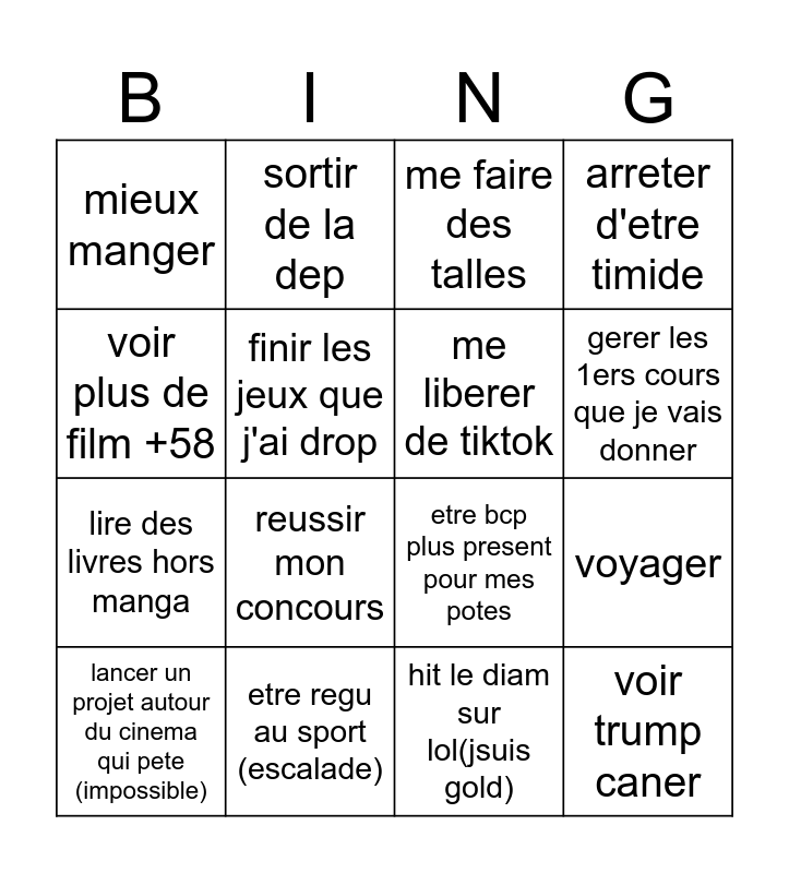 This bingo card has 16 words: etre regu au sport (escalade), voyager, me faire des talles, mieux manger, lire des livres hors manga, sortir de la dep, etre bcp plus present pour mes potes, hit le diam sur lol(jsuis gold), voir plus de film +58, finir les jeux que j'ai drop, lancer un projet autour du cinema qui pete (impossible), arreter d'etre timide, reussir mon concours, gerer les 1ers cours que je vais donner, me liberer de tiktok and voir trump caner.