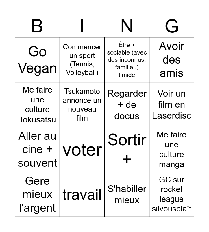 This bingo card has 16 words: travail, Me faire une culture manga, Être + sociable (avec des inconnus, famille..) timide, Go Vegan, Aller au cine + souvent, Commencer un sport (Tennis, Volleyball), Sortir +, S'habiller mieux, Me faire une culture Tokusatsu, Tsukamoto annonce un nouveau film, Gere mieux l'argent, Avoir des amis, voter, Voir un film en Laserdisc, Regarder + de docus and GC sur rocket league silvousplaît.