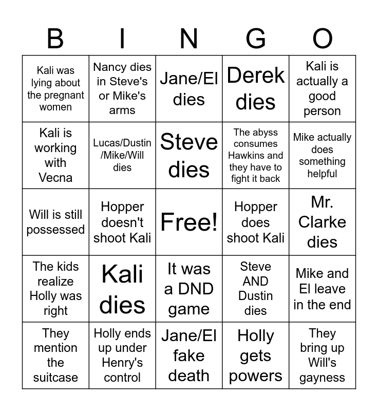 This bingo card has a free space and 24 words: Kali dies, Holly ends up under Henry's control, Steve dies, They mention the suitcase, Kali is actually a good person, Kali was lying about the pregnant women, Kali is working with Vecna, Nancy dies in Steve's or Mike's arms, Hopper does shoot Kali, It was a DND game, The abyss consumes Hawkins and they have to fight it back, Will is still possessed, Steve AND Dustin dies, Mike and El leave in the end, Lucas/Dustin /Mike/Will dies, Holly gets powers, Mr. Clarke dies, Jane/El dies, Mike actually does something helpful, Hopper doesn't shoot Kali, They bring up Will's gayness, The kids realize Holly was right, Derek dies and Jane/El fake death.