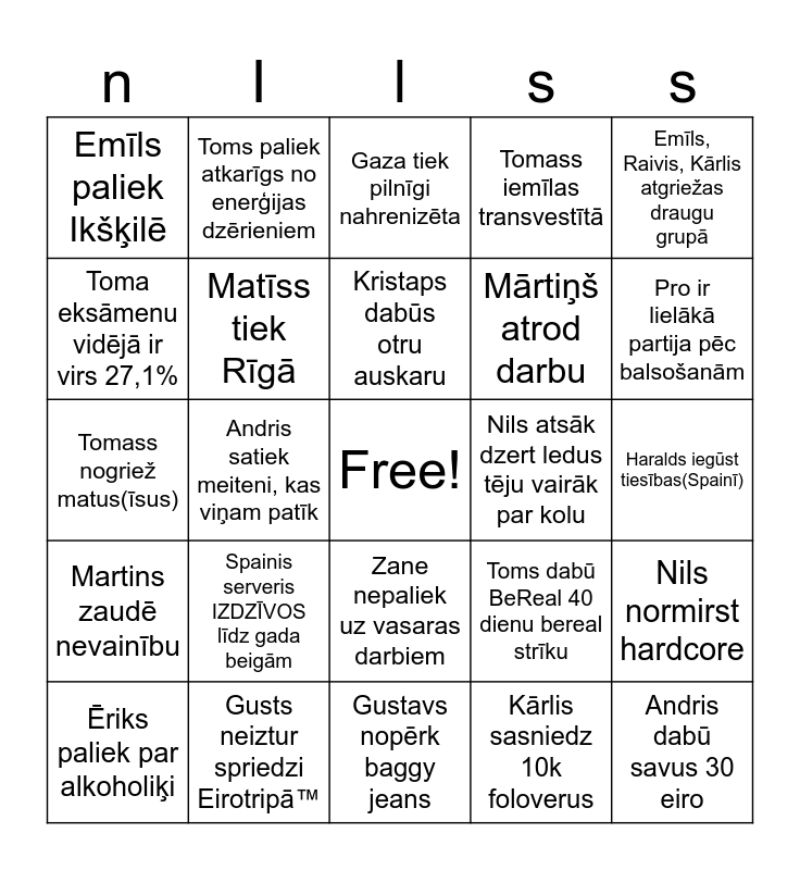 This bingo card has a free space and 24 words: Spainis serveris IZDZĪVOS līdz gada beigām, Gusts neiztur spriedzi Eirotripā™, Kristaps dabūs otru auskaru, Ēriks paliek par alkoholiķi, Emīls, Raivis, Kārlis atgriežas draugu grupā, Emīls paliek Ikšķilē, Toma eksāmenu vidējā ir virs 27,1%, Toms paliek atkarīgs no enerģijas dzērieniem, Nils atsāk dzert ledus tēju vairāk par kolu, Zane nepaliek uz vasaras darbiem, Mārtiņš atrod darbu, Tomass nogriež matus(īsus), Toms dabū BeReal 40 dienu bereal strīku, Nils normirst hardcore, Matīss tiek Rīgā, Kārlis sasniedz 10k foloverus, Haralds iegūst tiesības(Spainī), Gaza tiek pilnīgi nahrenizēta, Pro ir lielākā partija pēc balsošanām, Andris satiek meiteni, kas viņam patīk, Andris dabū savus 30 eiro, Martins zaudē nevainību, Tomass iemīlas transvestītā and Gustavs nopērk baggy jeans.