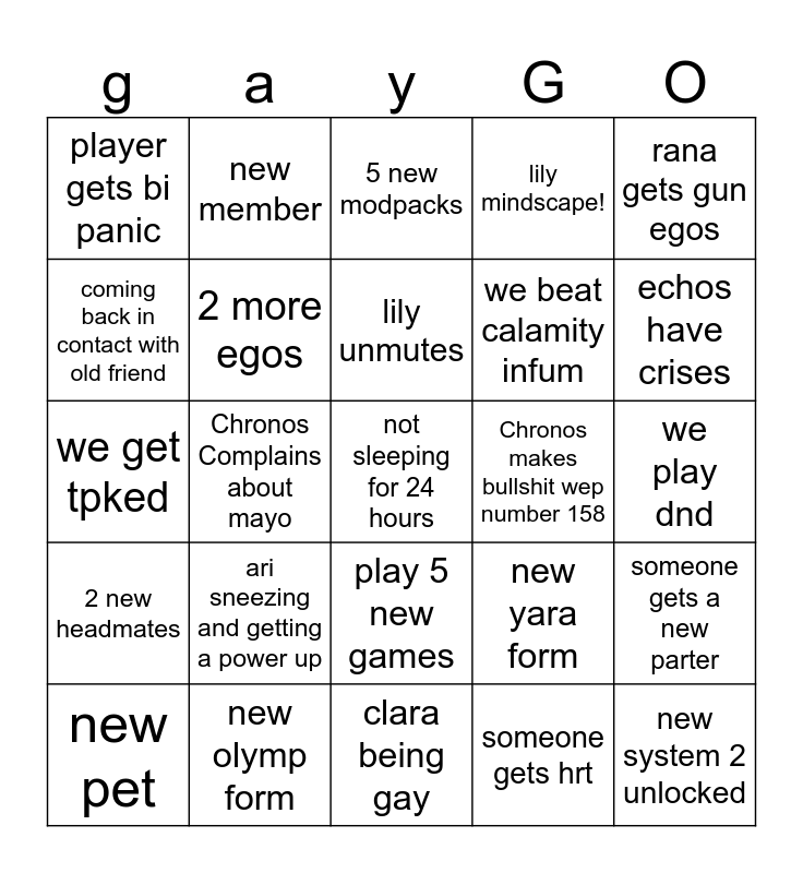 This bingo card has 25 words: 2 new headmates, new olymp form, not sleeping for 24 hours, someone gets hrt, rana gets gun egos, player gets bi panic, new member, 5 new modpacks, Chronos makes bullshit wep number 158, someone gets a new parter, coming back in contact with old friend, 2 more egos, clara being gay, new yara form, echos have crises, new pet, Chronos Complains about mayo, lily unmutes, we beat calamity infum, we play dnd, we get tpked, ari sneezing and getting a power up, play 5 new games, lily mindscape! and new system 2 unlocked.