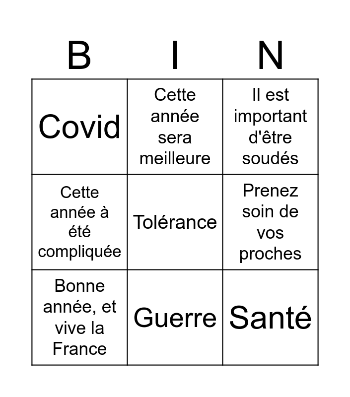 This bingo card has a free space and 8 words: Cette année à été compliquée, Cette année sera meilleure, Prenez soin de vos proches, Bonne année, et vive la France, Il est important d'être soudés, Covid, Guerre and Santé.