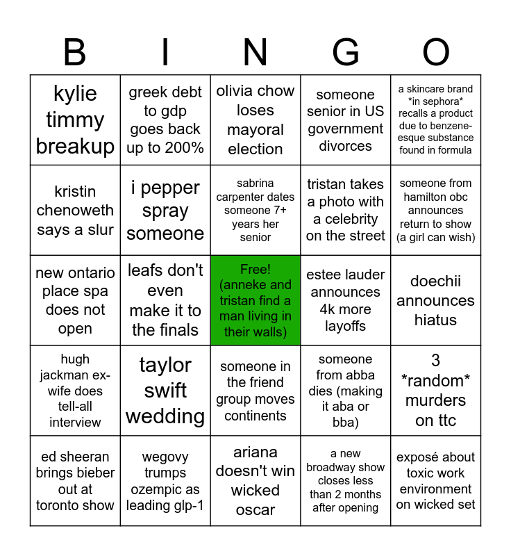 This bingo card has a free space and 24 words: taylor swift wedding, wegovy trumps ozempic as leading glp-1, sabrina carpenter dates someone 7+ years her senior, ed sheeran brings bieber out at toronto show, a skincare brand *in sephora* recalls a product due to benzene-esque substance found in formula, kylie timmy breakup, kristin chenoweth says a slur, greek debt to gdp goes back up to 200%, estee lauder announces 4k more layoffs, someone in the friend group moves continents, tristan takes a photo with a celebrity on the street, new ontario place spa does not open, someone from abba dies (making it aba or bba), 3 *random* murders on ttc, i pepper spray someone, a new broadway show closes less than 2 months after opening, doechii announces hiatus, olivia chow loses mayoral election, someone from hamilton obc announces return to show (a girl can wish), leafs don't even make it to the finals, exposé about toxic work environment on wicked set, hugh jackman ex-wife does tell-all interview, someone senior in US government divorces and ariana doesn't win wicked oscar.