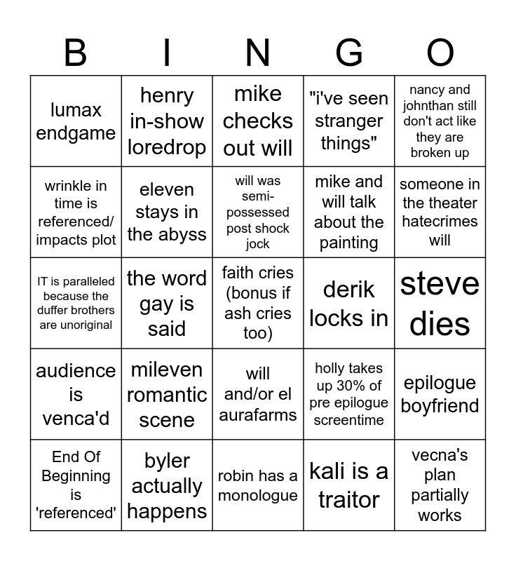 This bingo card has a free space and 24 words: mileven romantic scene, byler actually happens, will was semi-possessed post shock jock, End Of Beginning is 'referenced', nancy and johnthan still don't act like they are broken up, lumax endgame, wrinkle in time is referenced/ impacts plot, henry in-show loredrop, derik locks in, will and/or el aurafarms, mike and will talk about the painting, IT is paralleled because the duffer brothers are unoriginal, holly takes up 30% of pre epilogue screentime, epilogue boyfriend, eleven stays in the abyss, kali is a traitor, steve dies, mike checks out will, someone in the theater hatecrimes will, the word gay is said, vecna's plan partially works, audience is venca'd, "i've seen stranger things" and robin has a monologue.