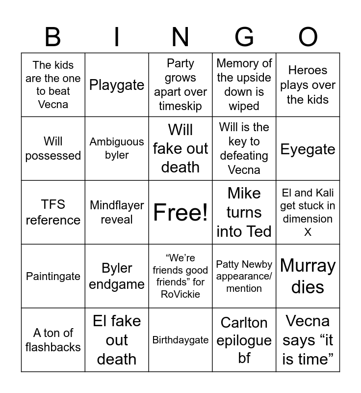 This bingo card has a free space and 24 words: Byler endgame, El fake out death, Will fake out death, A ton of flashbacks, Heroes plays over the kids, The kids are the one to beat Vecna, Will possessed, Playgate, Mike turns into Ted, “We’re friends good friends” for RoVickie, Will is the key to defeating Vecna, TFS reference, Patty Newby appearance/ mention, Murray dies, Ambiguous byler, Carlton epilogue bf, El and Kali get stuck in dimension X, Party grows apart over timeskip, Eyegate, Mindflayer reveal, Vecna says “it is time”, Paintingate, Memory of the upside down is wiped and Birthdaygate.