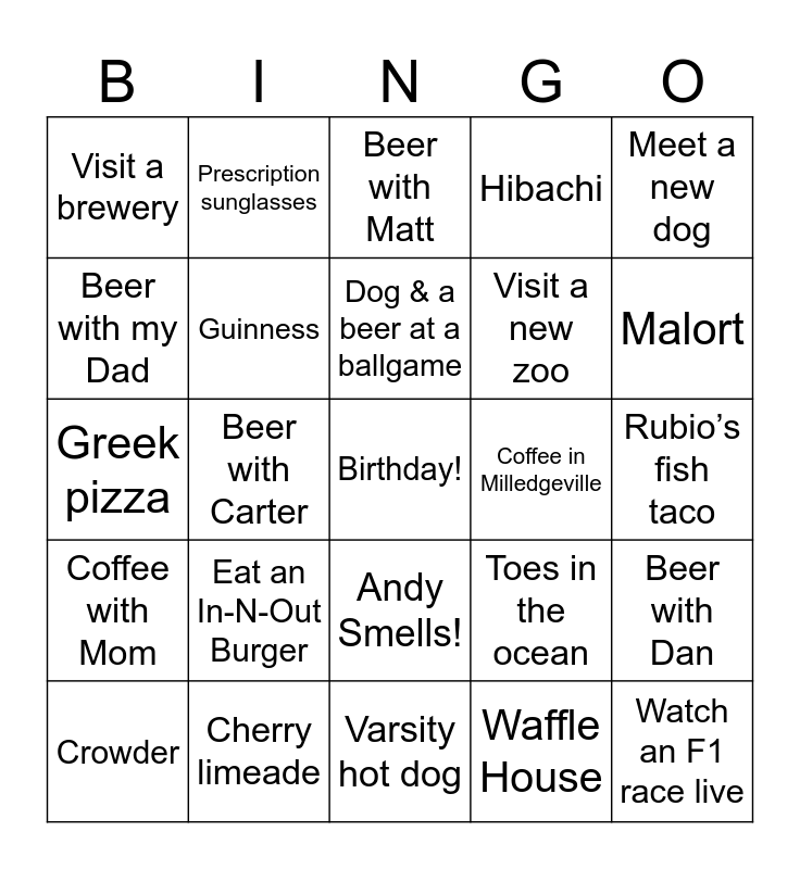 This bingo card has a free space and 24 words: Eat an In-N-Out Burger, Cherry limeade, Dog & a beer at a ballgame, Crowder, Meet a new dog, Visit a brewery, Beer with my Dad, Prescription sunglasses, Coffee in Milledgeville, Andy Smells!, Visit a new zoo, Greek pizza, Toes in the ocean, Beer with Dan, Guinness, Waffle House, Rubio’s fish taco, Beer with Matt, Malort, Beer with Carter, Watch an F1 race live, Coffee with Mom, Hibachi and Varsity hot dog.
