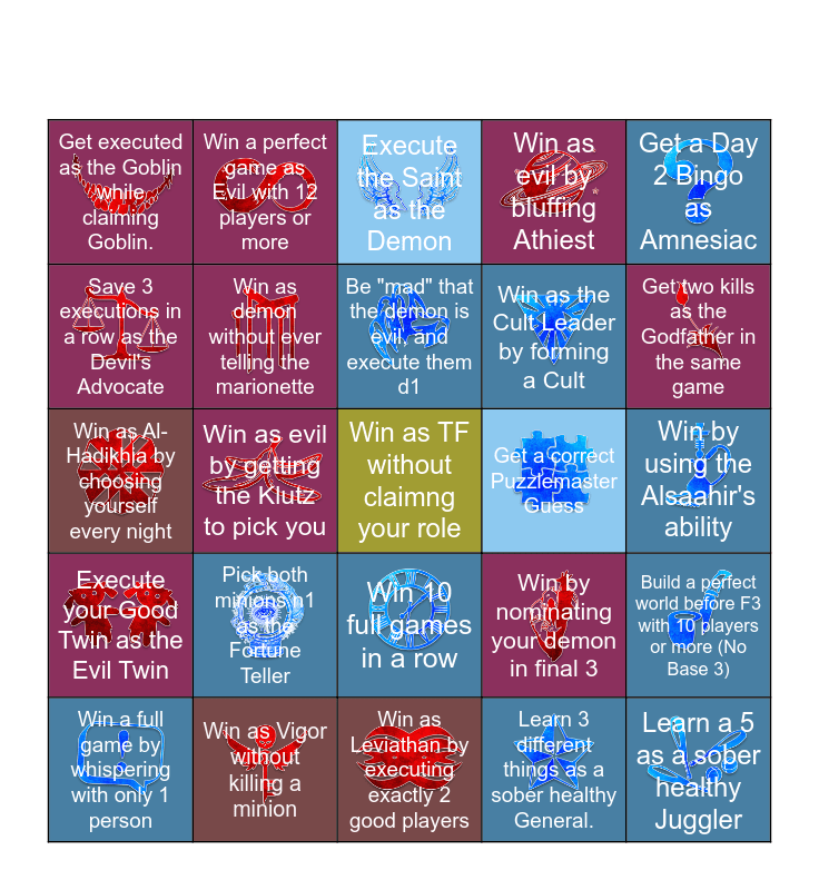 This bingo card has 30 images, a free space and 30 words: Win as Vigor without killing a minion, Save 3 players in one game as the Monk, Win as evil by getting the Klutz to pick you, Reach final 3 as Fisherman without using your ability, Get executed as the Goblin while claiming Goblin., Execute the Saint as the Demon, Win as demon without ever telling the marionette, Win 10 full games in a row, Get a correct Puzzlemaster Guess, Win as Leviathan by executing exactly 2 good players, Win by using the Alsaahir's ability, Learn a 5 as a sober healthy Juggler, Learn 3 different things as a sober healthy General., Win as the Fang Gu without jumping to an Outisder, Get two kills as the Godfather in the same game, Get a Mastermind win as Mastermind, Win by nominating your demon in final 3, Execute your Good Twin as the Evil Twin, Pick both minions n1 as the Fortune Teller, Get a Day 2 Bingo as Amnesiac, Win as Al-Hadikhia by choosing yourself every night, Die to a demon as a bait character with 10 players or more, Win a perfect game as Evil with 12 players or more, Win as the Cult Leader by forming a Cult, Save 3 executions in a row as the Devil's Advocate, Win as evil by bluffing Athiest, Build a perfect world before F3 with 10 players or more (No Base 3), Win a full game by whispering with only 1 person, Be "mad" that the demon is evil, and execute them d1 and Win an Athiest game as a Storyteller.