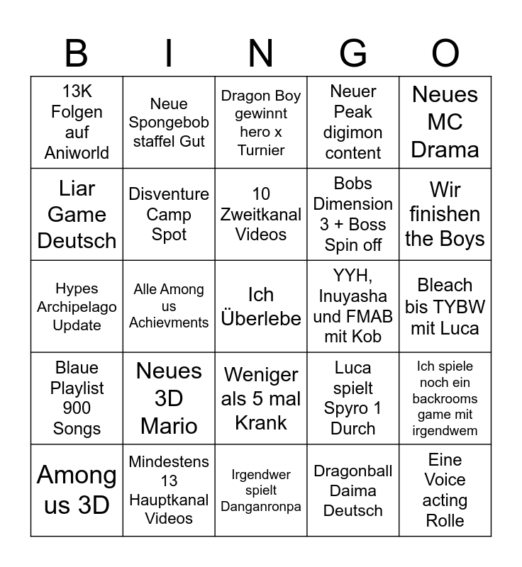 This bingo card has a free space and 24 words: Neues 3D Mario, Mindestens 13 Hauptkanal Videos, 10 Zweitkanal Videos, Among us 3D, Neues MC Drama, 13K Folgen auf Aniworld, Liar Game Deutsch, Neue Spongebob staffel Gut, YYH, Inuyasha und FMAB mit Kob, Weniger als 5 mal Krank, Bobs Dimension 3 + Boss Spin off, Hypes Archipelago Update, Luca spielt Spyro 1 Durch, Ich spiele noch ein backrooms game mit irgendwem, Disventure Camp Spot, Dragonball Daima Deutsch, Bleach bis TYBW mit Luca, Dragon Boy gewinnt hero x Turnier, Wir finishen the Boys, Alle Among us Achievments, Eine Voice acting Rolle, Blaue Playlist 900 Songs, Neuer Peak digimon content and Irgendwer spielt Danganronpa.