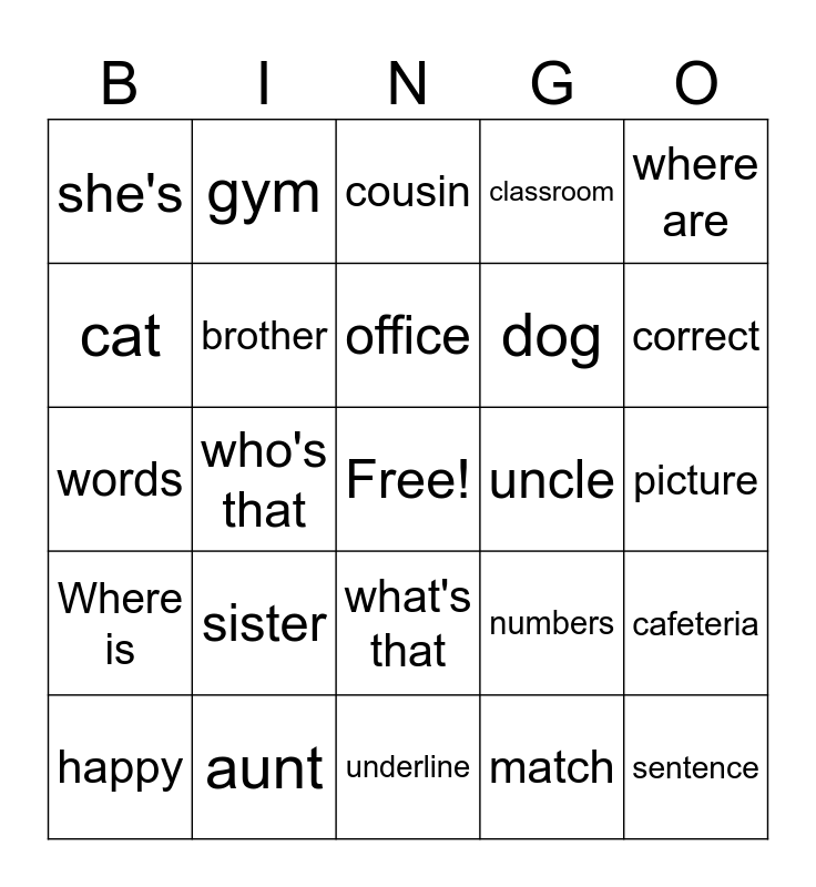 This bingo card has a free space and 29 words: happy, new year, who's that, he's, she's, cousin, brother, sister, uncle, aunt, picture, sentence, underline, match, correct, answer, what's that, Where is, where are, words, numbers, pets, dog, cat, classroom, gym, cafeteria, office and parrot.