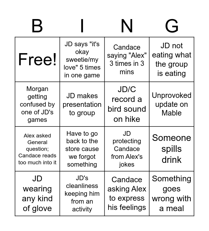 This bingo card has 16 words: JD wearing any kind of glove, JD's cleanliness keeping him from an activity, Candace saying "Alex" 3 times in 3 mins, JD not eating what the group is eating, Morgan getting confused by one of JD's games, JD says "it's okay sweetie/my love" 5 times in one game, JD protecting Candace from Alex's jokes, Someone spills drink, Free!, JD makes presentation to group, Candace asking Alex to express his feelings, Unprovoked update on Mable, Alex asked General question; Candace reads too much into it, Have to go back to the store cause we forgot something, JD/C record a bird sound on hike and Something goes wrong with a meal.