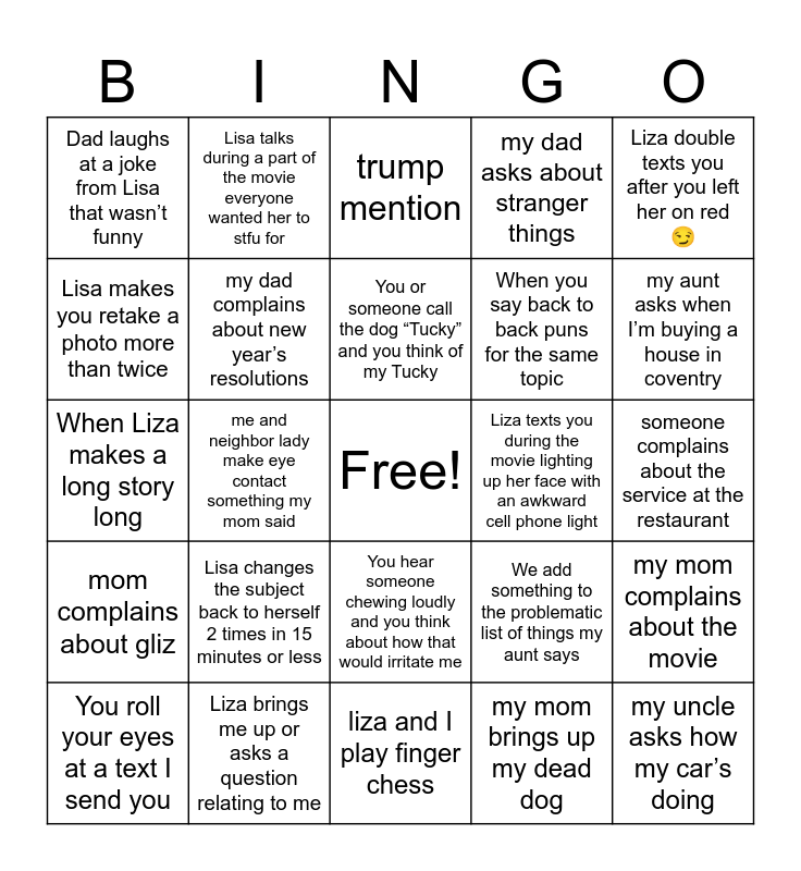 This bingo card has a free space and 24 words: Lisa changes the subject back to herself 2 times in 15 minutes or less, Liza brings me up or asks a question relating to me, You or someone call the dog “Tucky” and you think of my Tucky, You roll your eyes at a text I send you, Liza double texts you after you left her on red 😏, Dad laughs at a joke from Lisa that wasn’t funny, Lisa makes you retake a photo more than twice, Lisa talks during a part of the movie everyone wanted her to stfu for, Liza texts you during the movie lighting up her face with an awkward cell phone light, You hear someone chewing loudly and you think about how that would irritate me, When you say back to back puns for the same topic, When Liza makes a long story long, We add something to the problematic list of things my aunt says, my mom complains about the movie, my dad complains about new year’s resolutions, my mom brings up my dead dog, someone complains about the service at the restaurant, trump mention, my aunt asks when I’m buying a house in coventry, me and neighbor lady make eye contact something my mom said, my uncle asks how my car’s doing, mom complains about gliz, my dad asks about stranger things and liza and I play finger chess.
