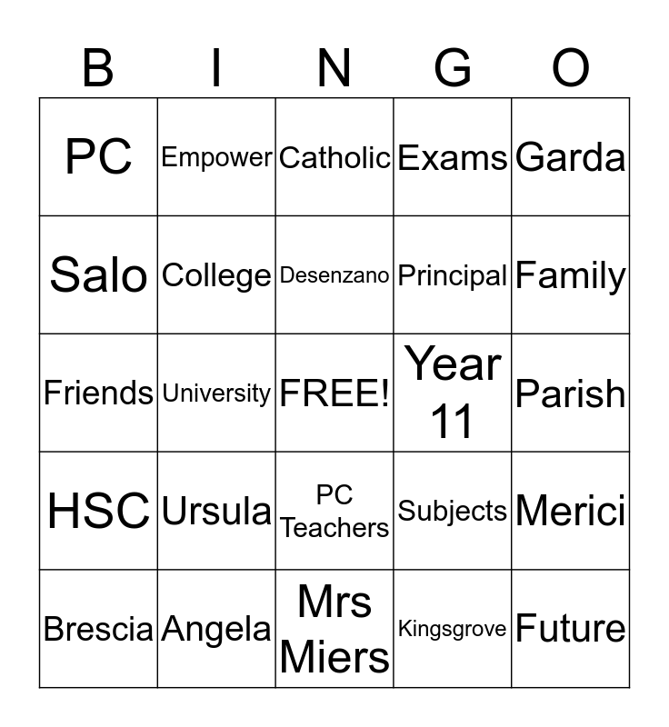 This bingo card has a free space and 24 words: Ursula, Angela, Desenzano, Brescia, Garda, PC, Salo, Empower, Year 11, PC Teachers, Principal, Friends, Subjects, Merici, College, Kingsgrove, Parish, Catholic, Family, University, Future, HSC, Exams and Mrs Miers.