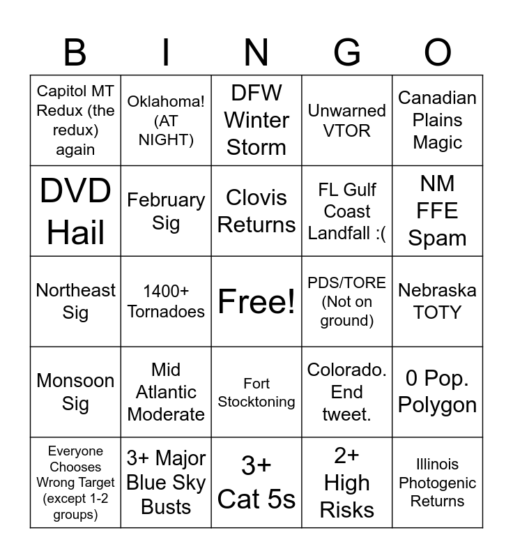 This bingo card has a free space and 24 words: Mid Atlantic Moderate, 3+ Major Blue Sky Busts, Clovis Returns, Everyone Chooses Wrong Target (except 1-2 groups), Canadian Plains Magic, Capitol MT Redux (the redux) again, DVD Hail, Oklahoma! (AT NIGHT), PDS/TORE (Not on ground), Fort Stocktoning, FL Gulf Coast Landfall :(, Northeast Sig, Colorado. End tweet., 0 Pop. Polygon, February Sig, 2+ High Risks, Nebraska TOTY, DFW Winter Storm, NM FFE Spam, 1400+ Tornadoes, Illinois Photogenic Returns, Monsoon Sig, Unwarned VTOR and 3+ Cat 5s.