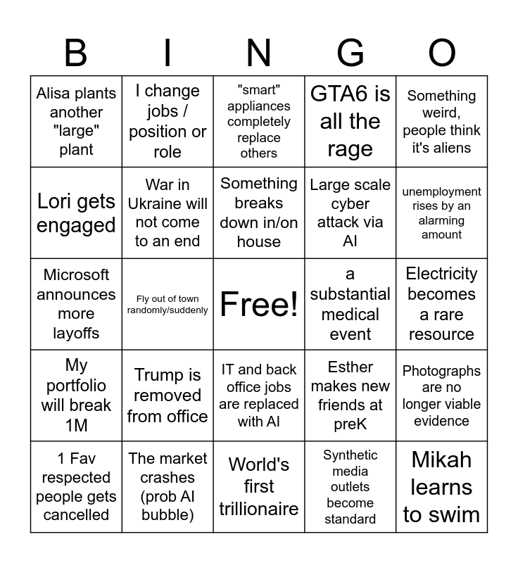 This bingo card has a free space and 24 words: Trump is removed from office, The market crashes (prob AI bubble), Something breaks down in/on house, 1 Fav respected people gets cancelled, Something weird, people think it's aliens, Alisa plants another "large" plant, Lori gets engaged, I change jobs / position or role, a substantial medical event, IT and back office jobs are replaced with AI, Large scale cyber attack via AI, Microsoft announces more layoffs, Esther makes new friends at preK, Photographs are no longer viable evidence, War in Ukraine will not come to an end, Synthetic media outlets become standard, Electricity becomes a rare resource, "smart" appliances completely replace others, unemployment rises by an alarming amount, Fly out of town randomly/suddenly, Mikah learns to swim, My portfolio will break 1M, GTA6 is all the rage and World's first trillionaire.