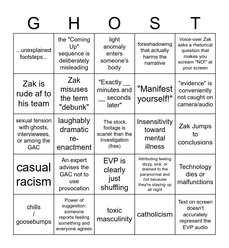 This bingo card has a free space and 24 words: An expert advises the GAC not to use provocation, Power of suggestion: someone reports feeling something and everyone agrees, "Exactly __ minutes and __ seconds later", chills / goosebumps, Voice-over Zak asks a rhetorical question that makes you scream "NO!" at your screen, ...unexplained footsteps..., Zak is rude af to his team, the "Coming Up" sequence is deliberately misleading, Insensitivity toward mental illness, EVP is clearly just shuffling, "Manifest yourself!", sexual tension with ghosts, interviewees, or among the GAC, Attributing feeling dizzy, sick, or drained to the paranormal and not because they're staying up all night, Technology dies or malfunctions, Zak misuses the term "debunk", catholicism, Zak Jumps to conclusions, light anomaly enters someone's body, "evidence" is conveniently not caught on camera/audio, laughably dramatic re-enactment, Text on screen doesn't accurately represent the EVP audio, casual racism, foreshadowing that actually harms the narrative and toxic masculinity.