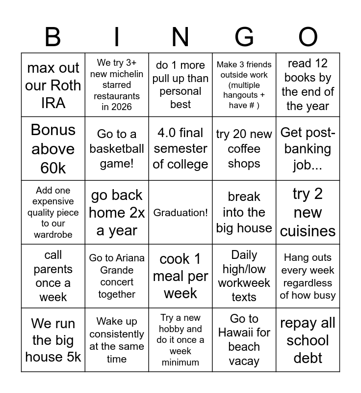 This bingo card has a free space and 24 words: We run the big house 5k, Go to Ariana Grande concert together, 4.0 final semester of college, Go to Hawaii for beach vacay, read 12 books by the end of the year, max out our Roth IRA, We try 3+ new michelin starred restaurants in 2026, do 1 more pull up than personal best, break into the big house, try 2 new cuisines, Add one expensive quality piece to our wardrobe, Go to a basketball game!, Daily high/low workweek texts, Hang outs every week regardless of how busy, Bonus above 60k, Wake up consistently at the same time, Try a new hobby and do it once a week minimum, Make 3 friends outside work (multiple hangouts + have # ), Get post-banking job..., call parents once a week, go back home 2x a year, cook 1 meal per week, try 20 new coffee shops and repay all school debt.