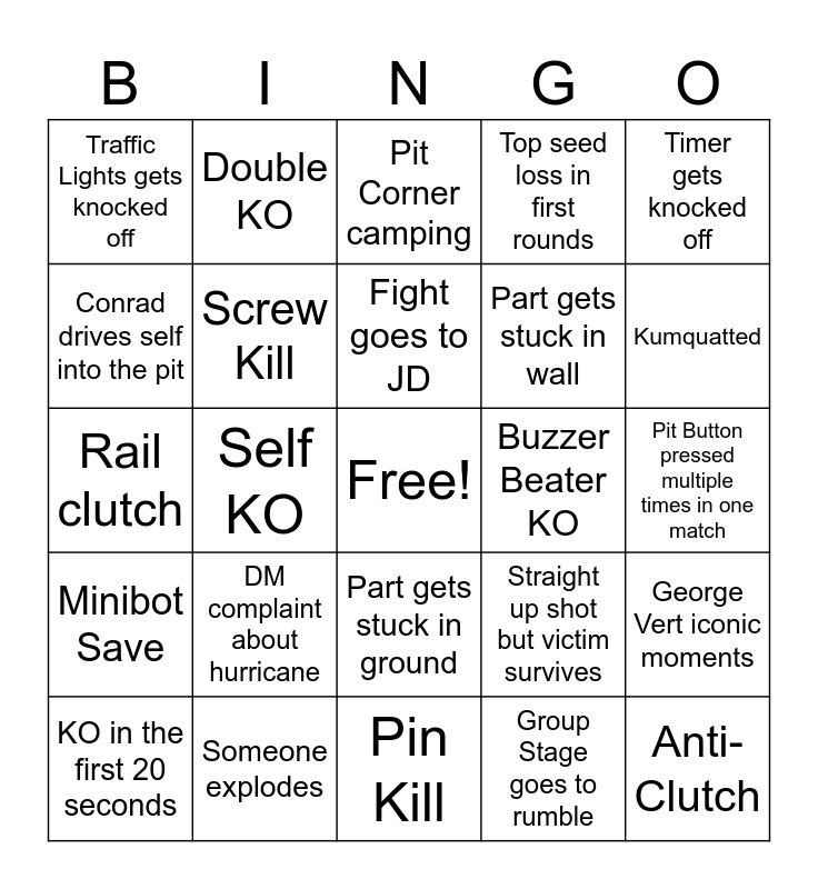 This bingo card has a free space and 24 words: DM complaint about hurricane, Someone explodes, Fight goes to JD, KO in the first 20 seconds, Timer gets knocked off, Traffic Lights gets knocked off, Conrad drives self into the pit, Double KO, Buzzer Beater KO, Part gets stuck in ground, Part gets stuck in wall, Rail clutch, Straight up shot but victim survives, George Vert iconic moments, Screw Kill, Group Stage goes to rumble, Pit Button pressed multiple times in one match, Pit Corner camping, Kumquatted, Self KO, Anti-Clutch, Minibot Save, Top seed loss in first rounds and Pin Kill.