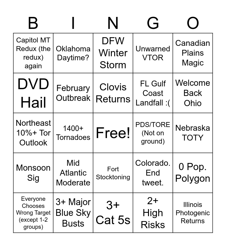 This bingo card has a free space and 24 words: Mid Atlantic Moderate, 3+ Major Blue Sky Busts, Clovis Returns, Everyone Chooses Wrong Target (except 1-2 groups), Canadian Plains Magic, Capitol MT Redux (the redux) again, DVD Hail, Oklahoma Daytime?, PDS/TORE (Not on ground), Fort Stocktoning, FL Gulf Coast Landfall :(, Northeast 10%+ Tor Outlook, Colorado. End tweet., 0 Pop. Polygon, February Outbreak, 2+ High Risks, Nebraska TOTY, DFW Winter Storm, Welcome Back Ohio, 1400+ Tornadoes, Illinois Photogenic Returns, Monsoon Sig, Unwarned VTOR and 3+ Cat 5s.