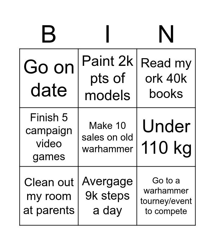 This bingo card has a free space and 8 words: Under 110 kg, Read my ork 40k books, Paint 2k pts of models, Clean out my room at parents, Go on date, Go to a warhammer tourney/event to compete, Finish 5 campaign video games and Avergage 9k steps a day.
