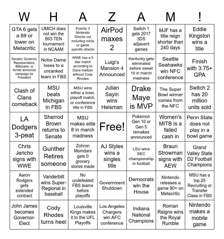This bingo card has a free space and 48 words: Democrats win the House, Seattle Seahawks win NFC conference, Los Angeles Chargers win AFC conference, Sherrod Brown returns to Senate, MSU wins either a bowl, playoff match, or conference title in FBS, Penn State does not play in a bowl game, UMICH does not win the BIG TEN tournament in NCAAM, Cody Rhodes turns heel, MJF has a title reign shorter than 240 days, AJ Styles wins a singles title, Eddie Kingston wins a title, AirPod maxes 2, The Super Bowl winner comes from the NFC, Drake Maye is MVP, Aaron Rodgers gets extended contract, Women’s MITB is a failed cash in, Senator, Governor, Representative, Billionaire, or former announce campaign for President, Finish with 3.75+ GPA, Nintendo releases a game 90+ on Metacritic, Switch 1 gets 2017 3DS adjacent games, Kentucky gets eliminated before sweet 16 in march madness, MSU makes elite 8 in march madness, GTA 6 gets a 89 or lower on Metacritic, Notre Dame loses to a unranked team in FBS, MSU has a top 25 Recruiting or Transfer Class in FBS, WWE has a 5 star match according to Dave meltzer without Cody Rhodes, Switch 2 has 20 million units sold, John James becomes Governor-Elect, Julian Sayin wins Heisman, MSU beats Michigan in FBS, Roman Reigns wins the Royal Rumble, Pokemon Gen 10 or Gen 5 remakes announced, Grand Valley State D2 Football Champions, Vanderbilt wins Super-Regional in baseball, LA Dodgers 3-peat, LSU wins SEC championship in football, Braun Strowman signs with AEW, Clash of Clans comeback, Zohron Momdani gets 0 grocery stores made, No undefeated FBS teams before playoffs, Chris Jericho signs with WWE, Nintendo makes a mobile game, Exactly 3 Nintendo Directs not including minis or game specific directs, Louisville Kings makes it to the UFL Playoffs, Luigi’s Mansion 4 Announced, Government Shutdown, Gunther Retires someone and Indiana National Champions.