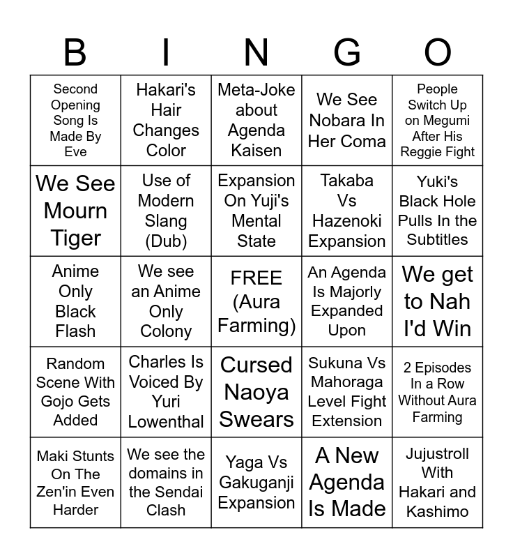 This bingo card has a free space and 24 words: Charles Is Voiced By Yuri Lowenthal, We see the domains in the Sendai Clash, Expansion On Yuji's Mental State, Maki Stunts On The Zen'in Even Harder, People Switch Up on Megumi After His Reggie Fight, Second Opening Song Is Made By Eve, We See Mourn Tiger, Hakari's Hair Changes Color, An Agenda Is Majorly Expanded Upon, Cursed Naoya Swears, Takaba Vs Hazenoki Expansion, Anime Only Black Flash, Sukuna Vs Mahoraga Level Fight Extension, 2 Episodes In a Row Without Aura Farming, Use of Modern Slang (Dub), A New Agenda Is Made, We get to Nah I'd Win, Meta-Joke about Agenda Kaisen, Yuki's Black Hole Pulls In the Subtitles, We see an Anime Only Colony, Jujustroll With Hakari and Kashimo, Random Scene With Gojo Gets Added, We See Nobara In Her Coma and Yaga Vs Gakuganji Expansion.