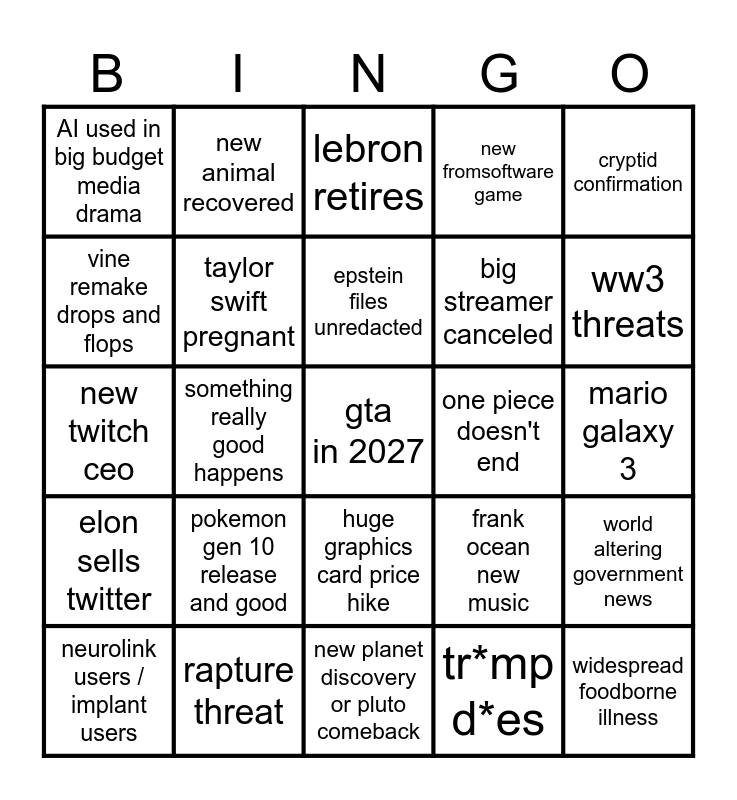 This bingo card has a free space and 24 words: neurolink users / implant users, pokemon gen 10 release and good, epstein files unredacted, tr*mp d*es, cryptid confirmation, AI used in big budget media drama, new animal recovered, lebron retires, one piece doesn't end, mario galaxy 3, new twitch ceo, taylor swift pregnant, frank ocean new music, world altering government news, vine remake drops and flops, rapture threat, new planet discovery or pluto comeback, new fromsoftware game, ww3 threats, elon sells twitter, something really good happens, huge graphics card price hike, big streamer canceled and widespread foodborne illness.