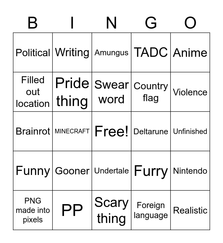 This bingo card has a free space and 24 words: Gooner, PP, Swear word, PNG made into pixels, Anime, Political, Filled out location, Writing, Deltarune, Undertale, Country flag, Brainrot, Furry, Nintendo, Pride thing, Foreign language, Unfinished, Amungus, Violence, MINECRAFT, Realistic, Funny, TADC and Scary thing.
