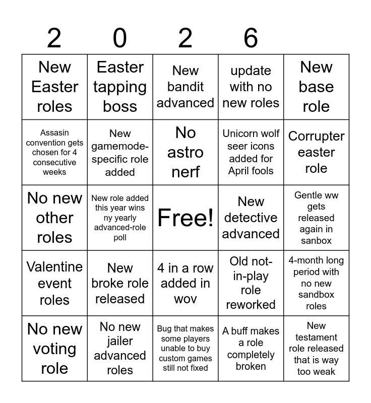 This bingo card has a free space and 24 words: No new voting role, New broke role released, No astro nerf, A buff makes a role completely broken, New base role, New Easter roles, Easter tapping boss, New bandit advanced, New detective advanced, Gentle ww gets released again in sanbox, No new other roles, New gamemode-specific role added, Old not-in-play role reworked, 4-month long period with no new sandbox roles, Assasin convention gets chosen for 4 consecutive weeks, No new jailer advanced roles, Bug that makes some players unable to buy custom games still not fixed, update with no new roles, Corrupter easter role, Valentine event roles, New role added this year wins ny yearly advanced-role poll, 4 in a row added in wov, Unicorn wolf seer icons added for April fools and New testament role released that is way too weak.