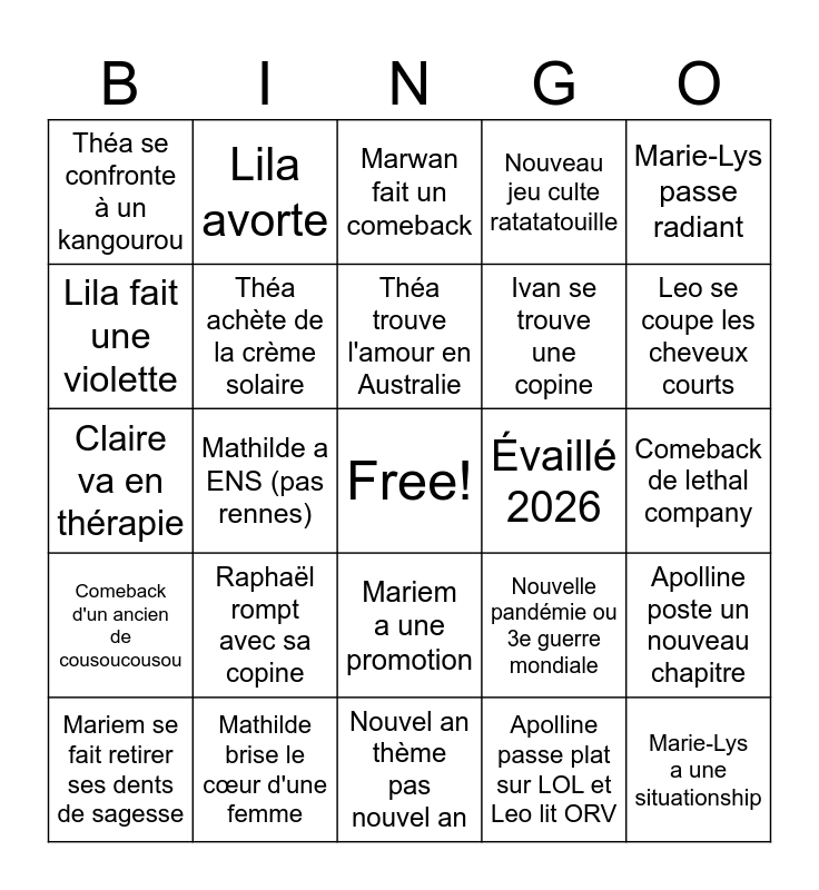 This bingo card has a free space and 24 words: Raphaël rompt avec sa copine, Mathilde brise le cœur d'une femme, Théa trouve l'amour en Australie, Mariem se fait retirer ses dents de sagesse, Marie-Lys passe radiant, Théa se confronte à un kangourou, Lila fait une violette, Lila avorte, Évaillé 2026, Mariem a une promotion, Ivan se trouve une copine, Claire va en thérapie, Nouvelle pandémie ou 3e guerre mondiale, Apolline poste un nouveau chapitre, Théa achète de la crème solaire, Apolline passe plat sur LOL et Leo lit ORV, Comeback de lethal company, Marwan fait un comeback, Leo se coupe les cheveux courts, Mathilde a ENS (pas rennes), Marie-Lys a une situationship, Comeback d'un ancien de cousoucousou, Nouveau jeu culte ratatatouille and Nouvel an thème pas nouvel an.
