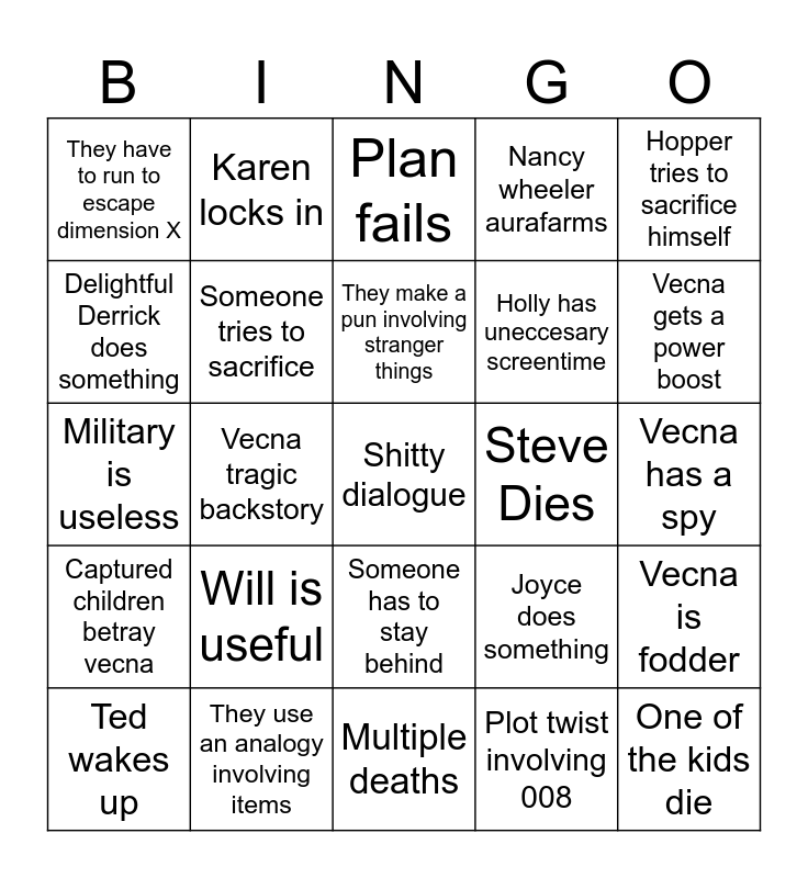 This bingo card has a free space and 24 words: Will is useful, They use an analogy involving items, They make a pun involving stranger things, Ted wakes up, Hopper tries to sacrifice himself, They have to run to escape dimension X, Delightful Derrick does something, Karen locks in, Steve Dies, Someone has to stay behind, Holly has uneccesary screentime, Military is useless, Joyce does something, Vecna is fodder, Someone tries to sacrifice, Plot twist involving 008, Vecna has a spy, Plan fails, Vecna gets a power boost, Vecna tragic backstory, One of the kids die, Captured children betray vecna, Nancy wheeler aurafarms and Multiple deaths.