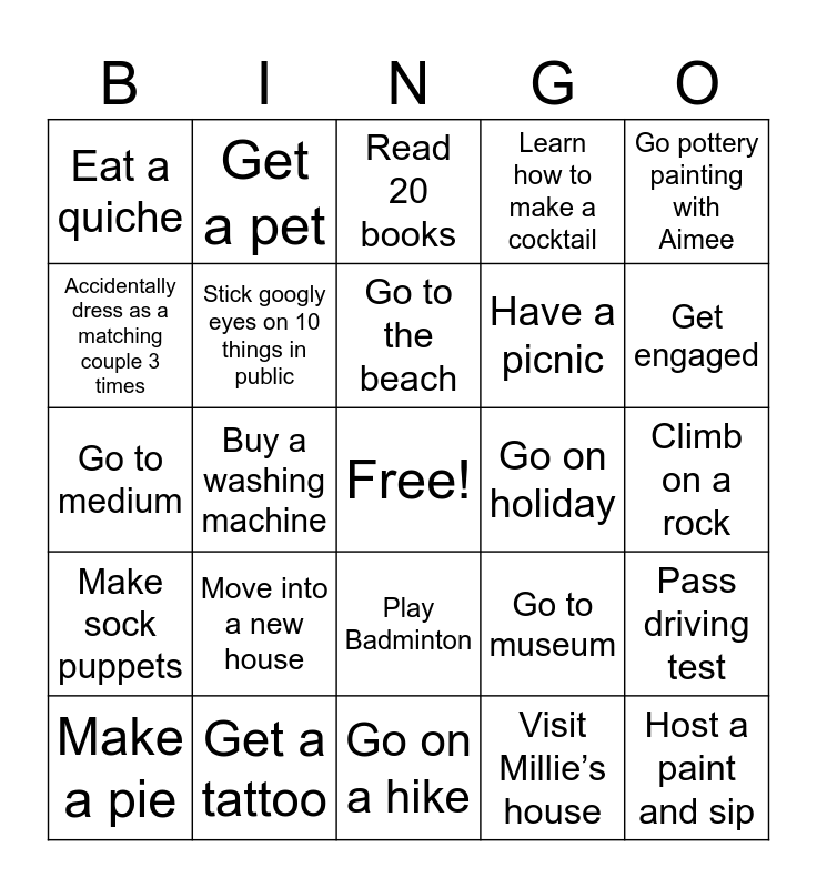 This bingo card has a free space and 25 words: Move into a new house, Go on a hike, Go to the beach, Make a pie, Go pottery painting with Aimee, Eat a quiche, Accidentally dress as a matching couple 3 times, Get a pet, Go on holiday, Play Badminton, Have a picnic, Go to medium, Go to museum, Pass driving test, Stick googly eyes on 10 things in public, Pet a pig, Climb on a rock, Read 20 books, Get engaged, Buy a washing machine, Host a paint and sip, Get a tattoo, Make sock puppets, Learn how to make a cocktail and Visit Millie’s house.