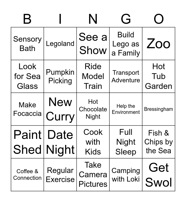 This bingo card has 25 words: Date Night, Take Camera Pictures, Ride Model Train, Coffee & Connection, Zoo, Sensory Bath, Look for Sea Glass, Legoland, Help the Environment, Cook with Kids, Transport Adventure, Make Focaccia, Full Night Sleep, Fish & Chips by the Sea, Pumpkin Picking, Get Swol, Bressingham, See a Show, Hot Tub Garden, New Curry, Hot Chocolate Night, Regular Exercise, Paint Shed, Build Lego as a Family and Camping with Loki.