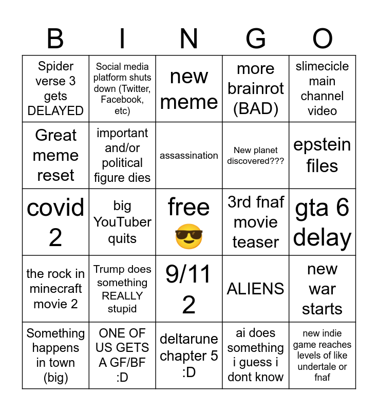 This bingo card has a free space and 24 words: Trump does something REALLY stupid, ONE OF US GETS A GF/BF :D, assassination, Something happens in town (big), slimecicle main channel video, Spider verse 3 gets DELAYED, Great meme reset, Social media platform shuts down (Twitter, Facebook, etc), 3rd fnaf movie teaser, 9/11 2, New planet discovered???, covid 2, ALIENS, new war starts, important and/or political figure dies, ai does something i guess i dont know, gta 6 delay, new meme, epstein files, big YouTuber quits, new indie game reaches levels of like undertale or fnaf, the rock in minecraft movie 2, more brainrot (BAD) and deltarune chapter 5 :D.