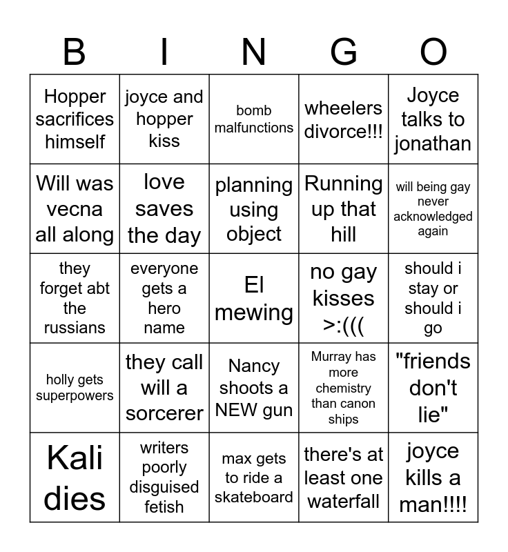 This bingo card has a free space and 24 words: they call will a sorcerer, writers poorly disguised fetish, planning using object, Kali dies, Joyce talks to jonathan, Hopper sacrifices himself, Will was vecna all along, joyce and hopper kiss, no gay kisses >:(((, Nancy shoots a NEW gun, Running up that hill, they forget abt the russians, Murray has more chemistry than canon ships, "friends don't lie", love saves the day, there's at least one waterfall, should i stay or should i go, bomb malfunctions, will being gay never acknowledged again, everyone gets a hero name, joyce kills a man!!!!, holly gets superpowers, wheelers divorce!!! and max gets to ride a skateboard.