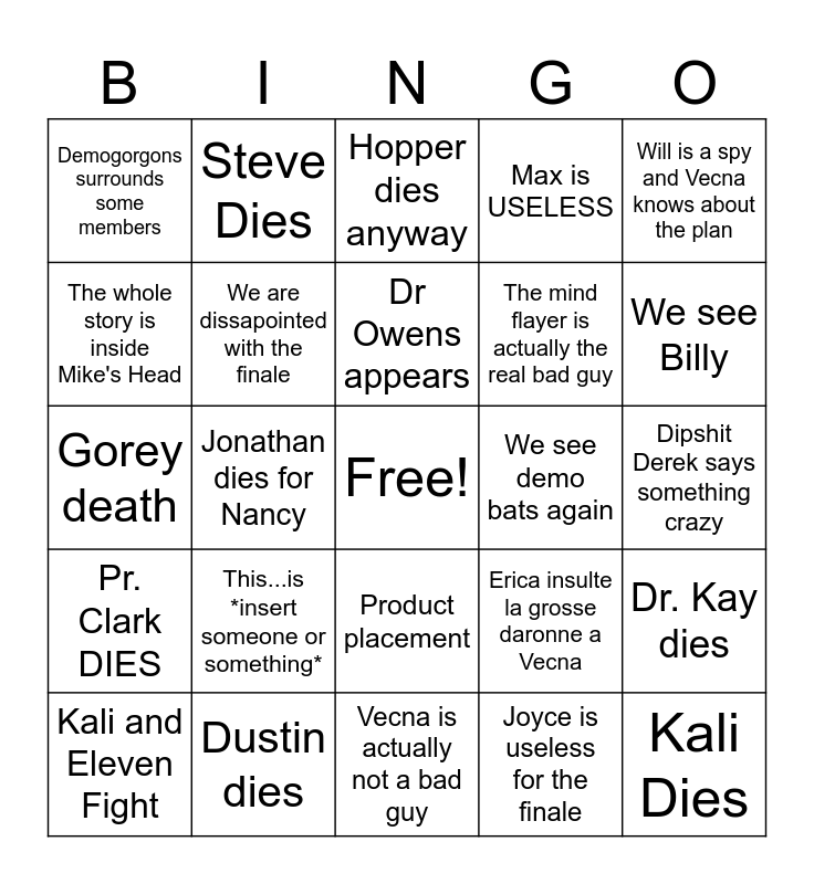 This bingo card has a free space and 24 words: This...is *insert someone or something*, Dustin dies, Dr Owens appears, Kali and Eleven Fight, Will is a spy and Vecna knows about the plan, Demogorgons surrounds some members, The whole story is inside Mike's Head, Steve Dies, We see demo bats again, Product placement, The mind flayer is actually the real bad guy, Gorey death, Erica insulte la grosse daronne a Vecna, Dr. Kay dies, We are dissapointed with the finale, Joyce is useless for the finale, Dipshit Derek says something crazy, Hopper dies anyway, We see Billy, Jonathan dies for Nancy, Kali Dies, Pr. Clark DIES, Max is USELESS and Vecna is actually not a bad guy.