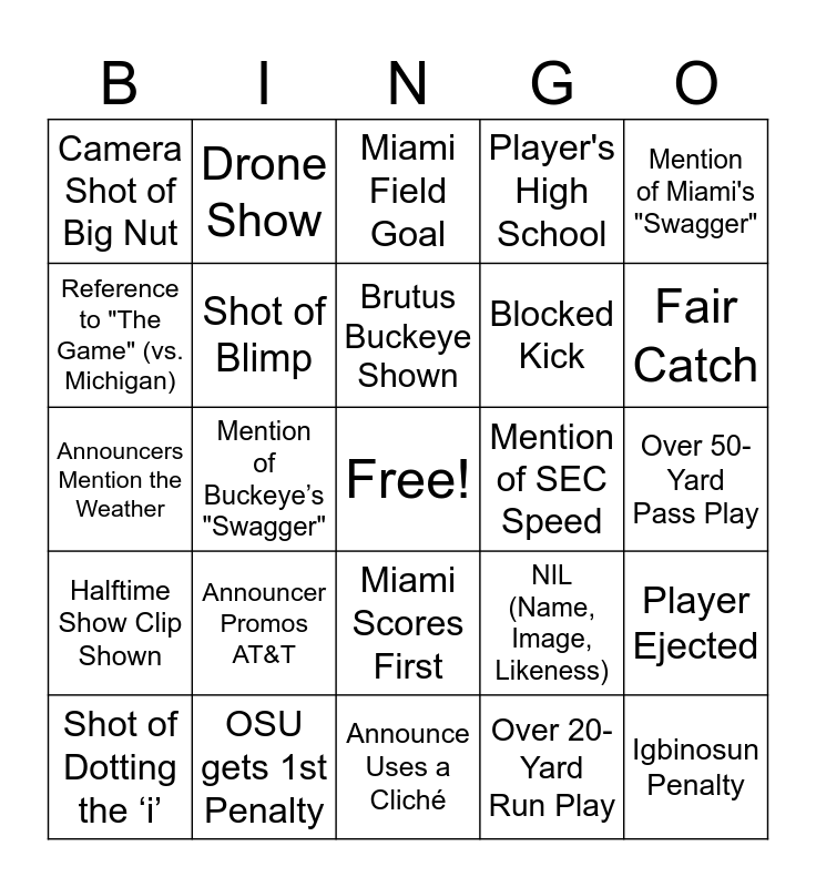 This bingo card has a free space and 76 words: Mention of OSU Defending Champs, OSU Touchdown, Miami Field Goal, Miami’s QB Sacked, Interception, Fumble Recovered, Play Call Overturned, Play Under Review, OSU Timeout, 4th Down Conversion, Punting Sucks, "O-H-I-O" Chant Heard, Brutus Buckeye Shown, Reference to "The Game" (vs. Michigan), Buckeye Leaf Stickers on Helmets Mentioned, Mention of Buckeye’s "Swagger", Shot of Sebastian the Ibis, Igbinosun Penalty, Miami Sideline Penalty, Mention of Miami's "Swagger", Mention of "Playoff Implications", Announcers Mention the Weather, Shot of Blimp, Drone Show, Player's High School, Any AI Promo, Video Game Promo, Disney+ Promo, Allstate Mayhem, Dr Pepper Fansville, Celebrity Commercial, Shot of Player's Family in Stands, Transfer Portal, NIL (Name, Image, Likeness), Fair Catch, Blocked Kick, Safety, Two-Point Conversion, Over 50-Yard Pass Play, Over 20-Yard Run Play, Missed Field Goal, Missed PAT, False Start Penalty, Miami gets 1st Penalty, Announcer jokes about colleague, Miami Targeting Call, Shot of Dotting the ‘i’, Camera Shot of Big Nut, Close-up of an OSU Helmet, OSU Scores First, Fan doing the "U" hand sign, Miami Scores First, Miami Timeout, Mention of Big Ten Dominance, Brutus Push Ups, Mention of Notre Dame Snub, Mention of 2026 CFP Expansion, Coach ‘Stop the Run’, Sign in the Crowd is Read by Announcers, Announcer Promos Goodyear, Announcer Promos AT&T, 3rd Down Sponsor, Coach ‘Take care of the ball’, Final Score Prediction Mentioned, Mention of 2003 Game, Coach ‘Gotta Make Plays’, Mention of SEC Speed, Overtime, Shot of CaneFreak, Coach ‘Need to Adjust’, Player Ejected, Halftime Show Clip Shown, OSU gets 1st Penalty, Mention Coach Day Calling Plays, Announce Uses a Cliché and OSU Band Member on Shoulders.