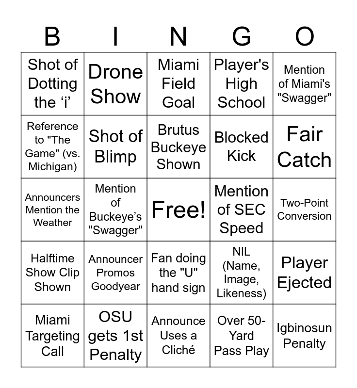 This bingo card has a free space and 77 words: Mention of OSU Defending Champs, OSU Touchdown, Miami Field Goal, Miami’s QB Sacked, Interception, Fumble Recovered, Play Call Overturned, Play Under Review, OSU Timeout, 4th Down Conversion, Punting Sucks, "O-H-I-O" Chant Heard, Brutus Buckeye Shown, Reference to "The Game" (vs. Michigan), Buckeye Leaf Stickers on Helmets Mentioned, Mention of Buckeye’s "Swagger", Shot of Sebastian the Ibis, Igbinosun Penalty, Miami Sideline Penalty, Mention of Miami's "Swagger", Mention of "Playoff Implications", Announcers Mention the Weather, Shot of Blimp, Drone Show, Player's High School, Any AI Promo, Video Game Promo, Disney+ Promo, Allstate Mayhem, Dr Pepper Fansville, Celebrity Commercial, Shot of Player's Family in Stands, Transfer Portal, NIL (Name, Image, Likeness), Fair Catch, Blocked Kick, Blocked Punt, Safety, Two-Point Conversion, Over 50-Yard Pass Play, Over 20-Yard Run Play, Missed Field Goal, Missed PAT, False Start Penalty, Miami gets 1st Penalty, Announcer jokes about colleague, Miami Targeting Call, Shot of Dotting the ‘i’, Camera Shot of Big Nut, Close-up of an OSU Helmet, OSU Scores First, Fan doing the "U" hand sign, Miami Scores First, Miami Timeout, Mention of Big Ten Dominance, Brutus Push Ups, Mention of Notre Dame Snub, Mention of 2026 CFP Expansion, Coach ‘Stop the Run’, Sign in the Crowd is Read by Announcers, Announcer Promos Goodyear, Announcer Promos AT&T, 3rd Down Sponsor, Coach ‘Take care of the ball’, Final Score Prediction Mentioned, Mention of 2003 Game, Coach ‘Gotta Make Plays’, Mention of SEC Speed, Overtime, Shot of CaneFreak, Coach ‘Need to Adjust’, Player Ejected, Halftime Show Clip Shown, OSU gets 1st Penalty, Mention Coach Day Calling Plays, Announce Uses a Cliché and OSU Band Member on Shoulders.